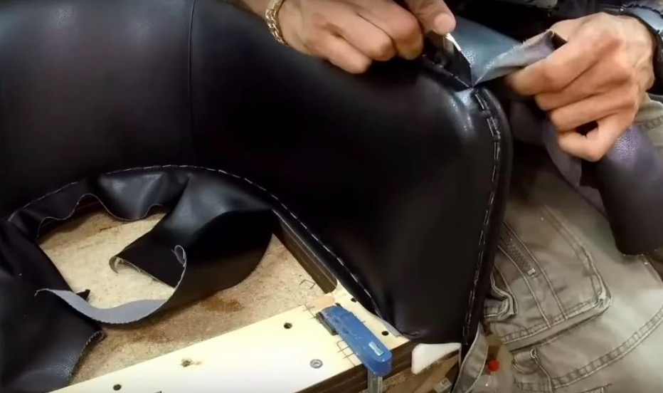 5. Обивка кожей, кожзамом или тканью сидушки и спинки. Крепление материалов совершается при помощи клейкой ленты, скоб и степлера.